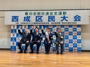 大会の中では、「春の全国交通安全運動」にあわせ、交通安全教育班による劇を交えたクイズが行われ、